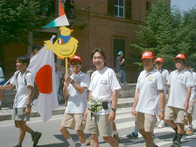飲み食いするうちに、雨は上がりワインと人の熱気で十分からだが暖まりました。そこを見計らったように、10時から、各国チームのパレードが行われ、鈴なりの人に囲まれた街の中心広場に入場しました。日本チームには「ナカター」のかけ声がかかっていました。小さな村の広場ですから、各国の選手ですぐいっぱいになってしまいましたが、どこか人ごみの向こうでしゃべっているご挨拶はそこそこに、聖火のような燭台に点火してパフォーマンスが始まりました。