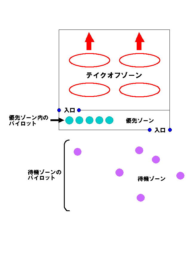 2. | 各パイロットはそれぞれ優先順位を示す番号を持ち、この番号が小さいほど優先順位が高い。複数のパイロットが同時にテイクオフを希望した場合、優先順位の高いパイロットが先にテイクオフゾーンへ進入できる。テイクオフの方式は基本的にフリーテイクオフであり、テイクオフを希望するパイロットが多数現れ、混雑した場合の優先順位を設けるものである。 |