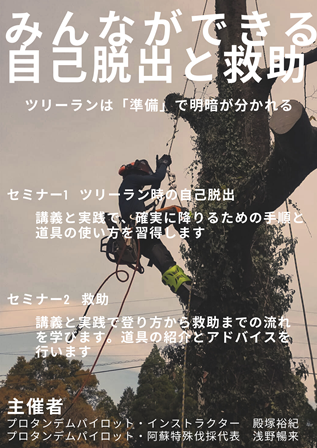 自己確保をしてハーネスの傾きを修正し救助を待つ方法から、万が一救助が来ない場合の自己脱出を特殊伐採技術を活用した簡単、確実、安全な方法を講義と実践で徹底的に学びます。